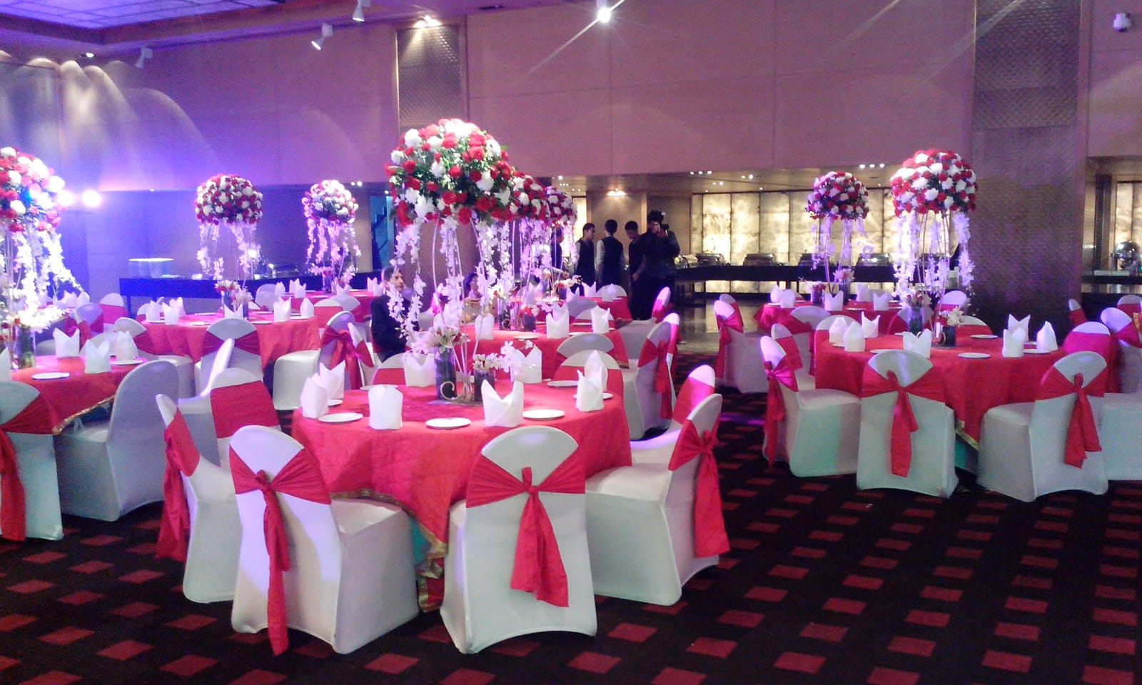 - The venue features round tables with red tablecloths and white chairs adorned with red bows.