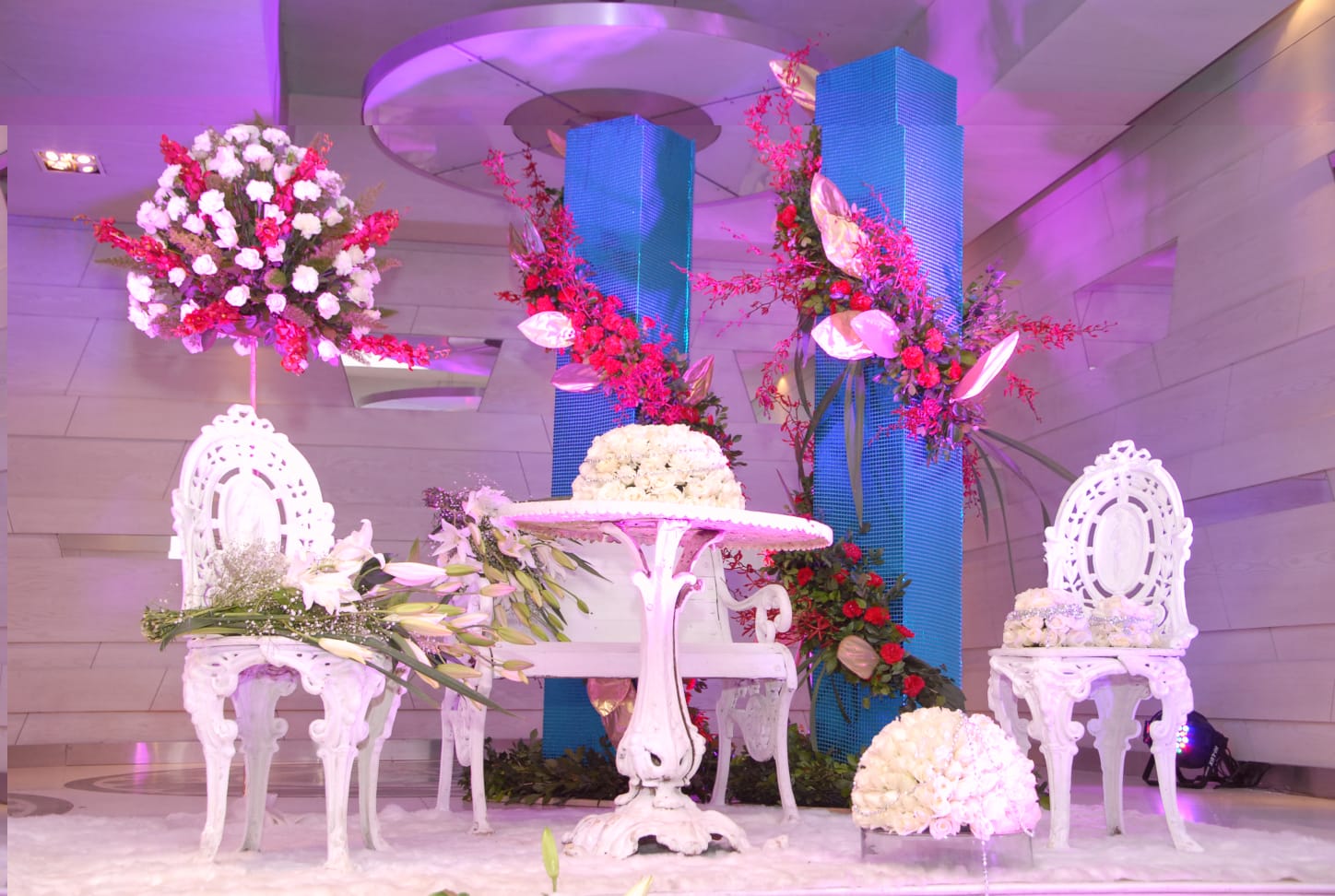 - The backdrop is composed of large blue columns accented with vibrant pink orchids and white flowers.