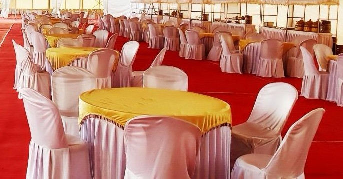 - The chairs are fitted with full-length slipcovers (often made of polyester or spandex) to hide the plain frame and create a uniform, elegant look.