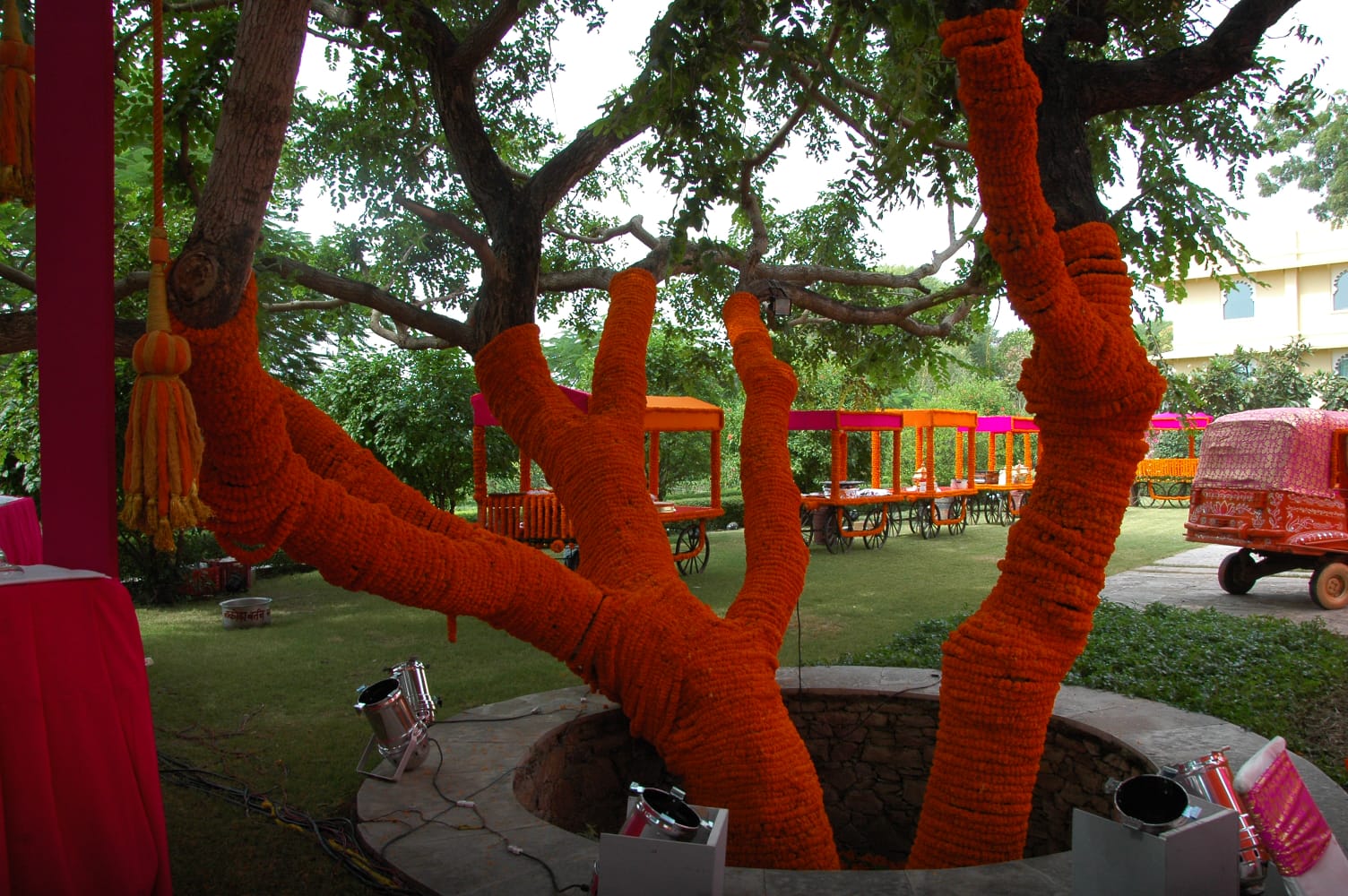 - The trunks and branches of the trees are intricately wrapped in bright orange fabric, a popular style for Indian wedding decor.